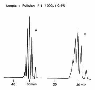 如下是使用水溶性尺寸排阻制备色谱柱OHpak SB-2002.5分析普鲁兰(Pullulan)样品时,流速对分析的影响。